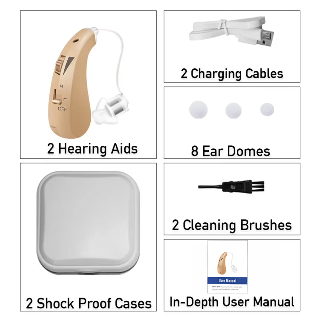 - A detailed and in-depth user manual that goes through everything you need to know about your new hearing aids, including: proper setup & care, getting a perfect in-ear fit, adjusting the hearing support to exactly what you need & more!