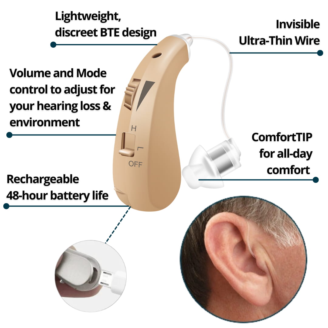 "I have been using these hearing aids for a year, and they have significantly improved my quality of life. They enable me to fully participate in conversations, and their affordability means I'm not constantly worried about losing them. Plus, they are rechargeable, so there's no need to constantly replace expensive and tiny batteries." - Mary T.